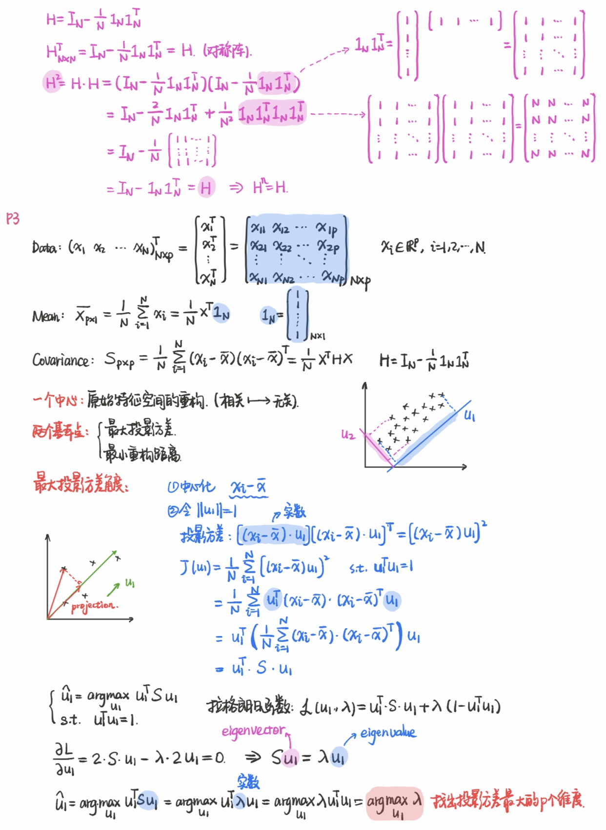 - 数据data特征矩阵表示;样本均值(Sample Mean);样本协方差(Sample Covariance);H为中心矩阵(centering matrix),中心矩阵将X每一维都减去均值,实现归一化。